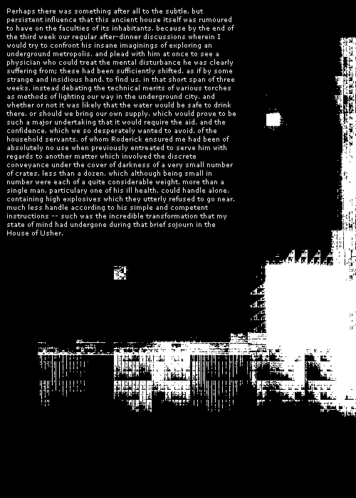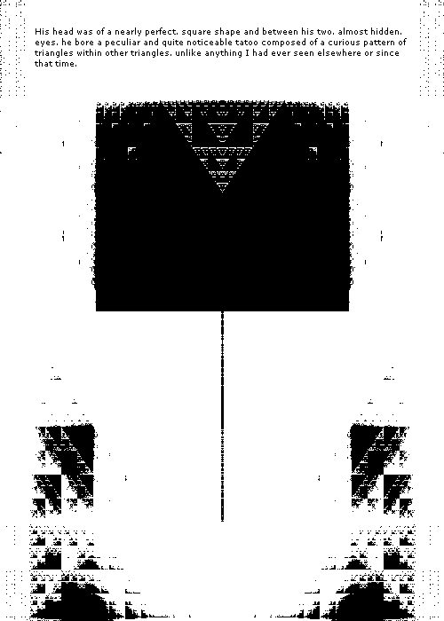 The main tool used in creating these sorts of images is a photoshop filter by Mario Klingemann called Extractor 1. It only has four sliders in it and the outcome is a literally, black and white image containing just two colors. This simple filter combined with the sierpinski triangle filter called multicrystal.8bf by Ilyich the Toad creates some very intricate images in the most primitive of all digital formats, binary.