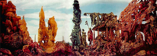 Compare this panorama (above) of mechanical imagery here (decalcomania) with the detailed and coherent narrative of Dali's expansive work. Mechanical creativity tends to be abstract and suggestive and lends itself to impressionist-like effect like the expression of human feeling rather than the depiction of human events. The mechanical technique in this painting is called, "decalcomania" which is basically just squishing paint between surfaces and pulling them apart. As in The Entire City, Ernst has embellished the automatic imagery with some hand-painted elements, like the two figures in the center and a few other realistic things in the rubble around there. I also suspect he did some creative arranging of the decalcomania elements because the structure to the immediate right of the bird-headed man looks too realistic to be accidental and purely mechanically produced. A little adjusting can sometimes have great effect with mechanical imagery although many wonders of mechanical creativity are to be found when it's left in it's raw and undomesticated state.