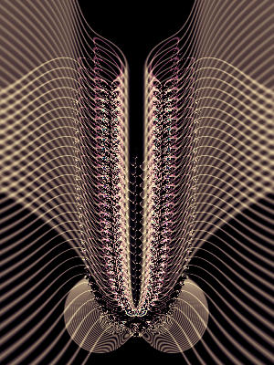I upped the stalks and bubbles on the Parameters dialog box from the default of .0500 to .1000. Formulas 50 and 52 give images similar to this. The arctan Transform setting is what makes this formula look like this. If you switch it back to the first Transform setting of "none" it doesn't look very interesting at all.