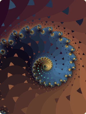 Here is a plain, normal fractal. I think it's a Mandelbrot, probably a Julia with biomorphs. The inside coloring isn't visible here. Also I used anti-aliasing and the palette emulator. Maybe I'm all wrong about this but I think the palette emulator colors the image with only two hundred and fifty-something individual colors. This produces an image with sharp color transitions which saves well as a png (or a gif). I think the palette emulator was designed to allow older, lower resolution video cards and monitors to display a half-decent image without using the higher resolution truecolor mode. I find it often produces sharper, more stylish, images that can be saved in indexed png format with a relatively small file size. In addition, Xaos will display newly generated palettes instantaneously if you use the palette emulator, even with anti-aliasing on. |