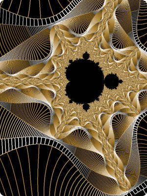 Mandelbrot formula, inside mode is "0", outside is color decompostion, bailout is the default of 4, plane is 1/(mu-4.0115). Put all that together, press the random palette key (P) a few times and you'll get something pretty close to this. There is a nice 3D appearance to the color decompostion ribbons. Again, however, this coloring mode doesn't produce much variety so I don't try it out much. |