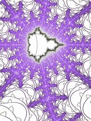 One of my very first "printed" images. This uses much the same parameters as the previous image except the inside is squares and the outside is biomorphs. The formula and plane are the same. I really like the mandelbrot's dark outline and the grey, pencil-like, inner shading with the single line like a belt across the "stomach." |