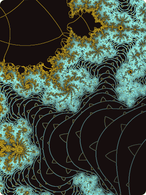 This is a detail from the plane, 1/(lambda-1) using the Mandelbrot formula, squares and biomorphs. I like the gold wires inside the mandelbrot that are made from the edges of the squares.