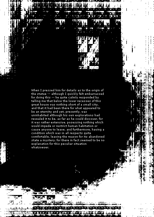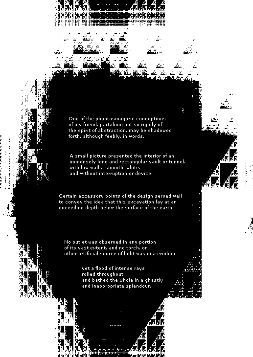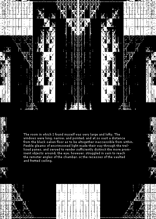 The main tool used in creating these sorts of images is a photoshop filter by Mario Klingemann called Extractor 1. It only has four sliders in it and the outcome is a literally, black and white image containing just two colors. This simple filter combined with the sierpinski triangle filter called multicrystal.8bf by Ilyich the Toad creates some very intricate images in the most primitive of all digital formats, binary.
