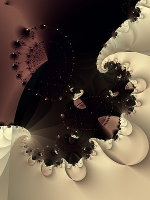 I anti-aliased this one 4:1 which gave the snow drifts a smoother edge. Here is another example of the contrasts which arctan seems to create. In this case, between the brown, chocolatey surfaces and the ivory colored "frosting." Although fractals are formulas repeated millions of times, they are very creative. The center seems to have a number of chocolate ships with whipped cream sails blown about in the little harbor.