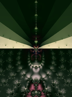 Another arctan transformed fractal. I like the sharp contrasting bands which resemble long streamers or banners of fabric. These banded areas occur in most arctan fractals and especially when used in Julia Mode.