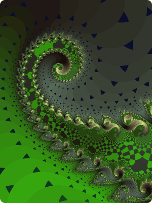 Most of the images in my gallery have been made with the anti-alias filter which produces these smooth enameled blocks of color. I don't have the parameter files for any of these images, but with a little experimentation anyone can produce ones like it. Here I've used the Phoenix formula with squares on the inside and biomorphs on the outside. Nothing special, most fractal programs will do this. Xaos's forte is the color. Gold, black, deep green and just the right shade of grey in the background. I produced it by pressing the "P" key (random palette) twenty or thirty times and stopping when I came to this. |