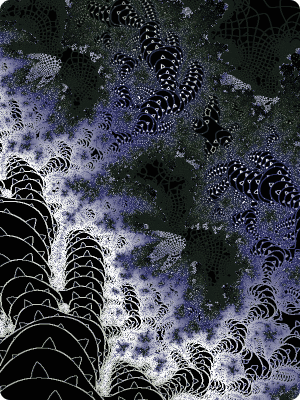 Another deep zoom from a rough area in a Phoenix Julia. This really shows how valuable the random palette generator in Xaos is. I couldn't have produced such a sophisticated color scheme myself. There is a misty glow from the roots in the lower left which appears to be reflected off the the tangled tentacles in the upper right. |