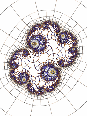 This and the next one are the exact same fractal image with only one parameter and the palette changed. This one is high bailout with binary decomposition. I like the mosaic appearance to the large gold and blue spirals.