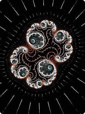 Same fractal image as the last one. This uses biomorphs instead of binary decomposition. Still the same high bailout setting. Some rotation has been used to angle the image. Originally, I had thought of making this gallery a collection of different types of images that I've made with Xaos and include their parameter files for further experimentation. This is what my Sterlingware Gallery is like. But somewhere along the way I dumped the idea because I didn't have the parameter files to most of the images I really liked and also, the menu options for Xaos are fairly simple. Since the big difference between images is the randomly generated palette, just knowing the formula and the coloring modes (which can easily be identified from the image anyhow) is enough to recreate the images. This group of two was meant as some kind of text book example to fit into my Xaos lecture. |