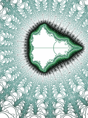 Here's something a little different. This is a detail from the first Mandelbrot formula (I rarely use the others) in the "1/(mu-1.40115)" (last one) plane. The palette gives the surrounding biomorphs a printed look. This look reminds me of the surface texture and line appearance of wood block or "intaligo" printing. I think the effect comes from the very gradual, single-color gradient in the palette with which the outside area is colored. |
