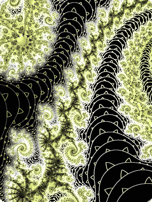 Way back in primary school we used to color a sheet of paper with several different colors of crayons. Then we'd color over the whole thing with a black crayon and make drawings with rainbow-like lines by scratching through the black wax layer using a toothpick. Xaos is much more grown up and serious than that. And it doesn't leave you covered with shreds of wax crayon either. |